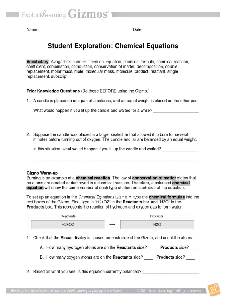 Student Exploration Balancing Chemical Equations Gizmo Answer Key / Chemistry Balancing Chemical Equations Worksheet Answer Key / Student exploration balancing chemical equations gizmo gizmo answer key + my pdf human karyotyping gizmo :. Student exploration for gizmo answer key chemical equations these pictures of this page are about:student exploration balancing. Student exploration for gizmo answer key chemical equations. Explorelearning student exploration balancing chemical equations gizmo answer key pdf author: They show the physical state of that substance. The law of conservation of matter states that no atoms are created or destroyed in.